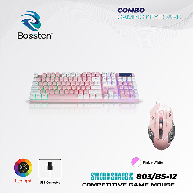 Model: 803 + BS12 Keyboard • Màu sắc: Blue-white/White-Blue/Pink-White/White-PinPurple-white/White-Purple + Mouse BS12 • Độ bền phím > 10.000.000 lượt nhấn • Chiều dài cáp: 1.5m USB • Số phím: 104 Key • Quy cách: 438 x 128 x 34mm • Led light Mouse: • Loại : Laser • Tuổi thọ click: 5.000.000 lượt click • DPI: DPI 800/1200/1600/2400 • Nút bấm: 4 nút - Back/Forward/ thanh cuộn/DPI • Dây dù chống nhiễu dài 1.5m USBSản phẩm Mới 100%